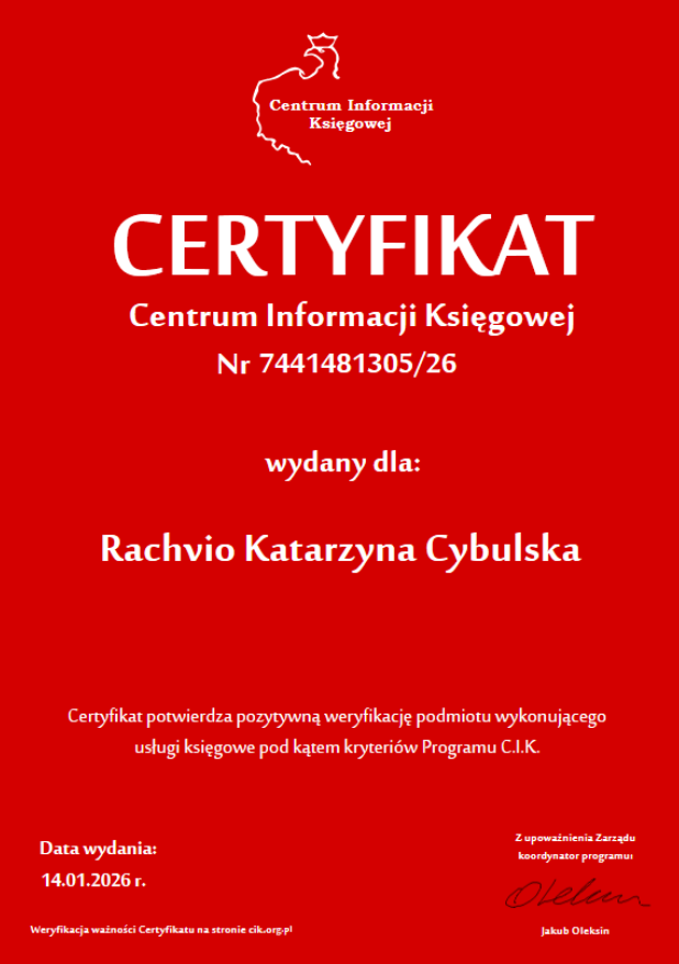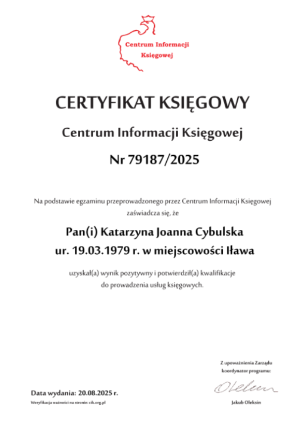 W branży księgowej pracuję od wielu lat, co pozwoliło mi poznać specyfikę różnych form opodatkowania oraz wyzwania, przed jakimi stają lokalni przedsiębiorcy. Korzystam ze sprawdzonych programów komputerowych, które przyspieszają obieg dokumentów i minimalizują ryzyko jakichkolwiek pomyłek. Posiadam niezbędne certyfikaty potwierdzające moje kwalifikacje, a systematyczne szkolenia pozwalają mi być na bieżąco z każdą zmianą w przepisach. Zapewniam Ci pełne bezpieczeństwo danych oraz terminowość, dzięki czemu możesz planować kolejne inwestycje z czystą głową.